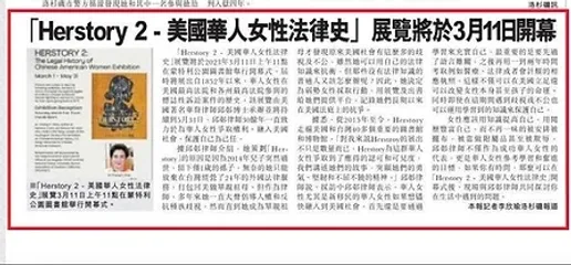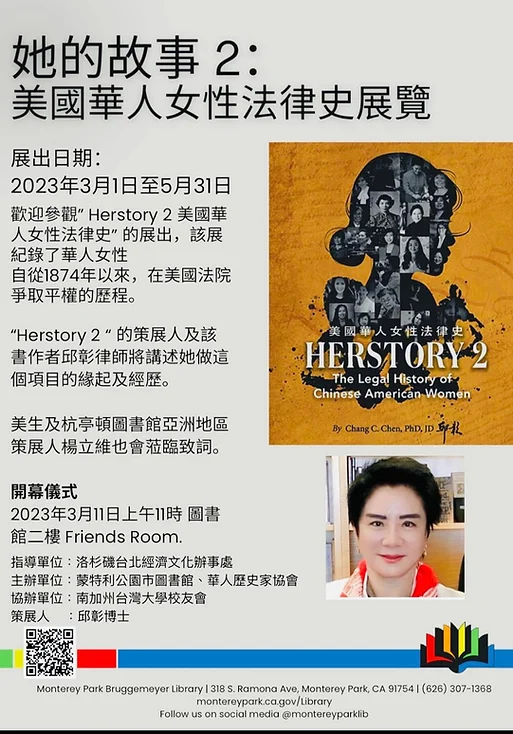 我們誠摯的邀請您出席“Herstory 2 – 美國華人女性法律史”展覽的開幕式,這個展覽呈列1852年以來華人女性在美國最高法院及各州最高法院參與的標竿性的訴訟案件的歷史。展覽於3月1日至5月31日展出,開幕式將於2023年3月11日上午11点在蒙特利公園圖書館举行。