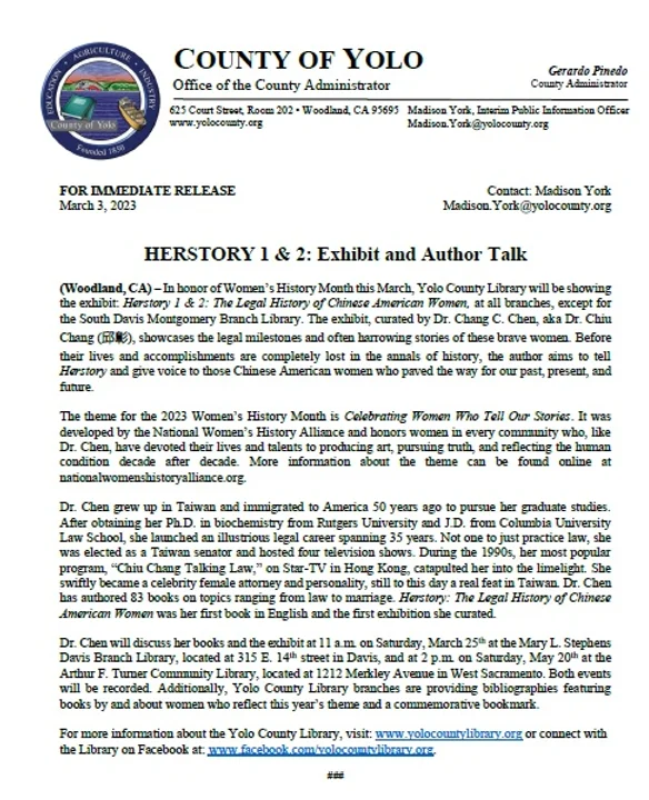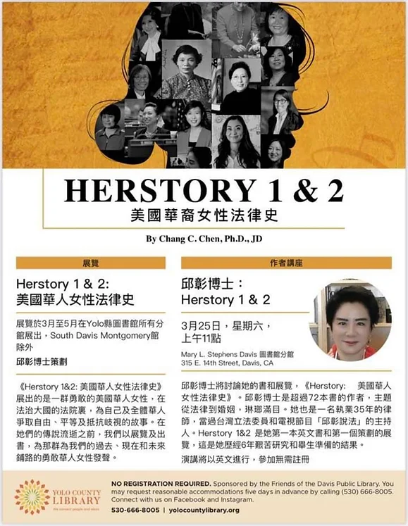 (Woodland, CA) – In honor of Women’s History Month this March, Yolo County Library will be showing the exhibit: Herstory 1 & 2: The Legal History of Chinese American Women, at all branches, except for the South Davis Montgomery Branch Library. The exhibit, curated by Dr. Chang C. Chen, aka Dr. Chiu Chang (邱彰), showcases the legal milestones and often harrowing stories of these brave women. Before their lives and accomplishments are completely lost in the annals of history, the author aims to tell Herstory and give voice to those Chinese American women who paved the way for our past, present, and future.